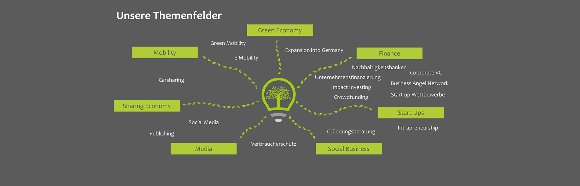 Unsere Kernkompetenz ist die Geschäftsfeldentwicklung nachhaltiger Produkte und Dienstleistungen. Hierbei agieren wir meist an der Schnittstelle zwischen Green Economy und Digital Economy. Die Leitplanken unserer Themenfelder werden durch die Begriffsdefinition nachhaltigen Wirtschaftens gezogen. Innerhalb dieser Grenzen sind wir in unterschiedlichen Themenfeldern seit Jahren erfolgreich tätig.